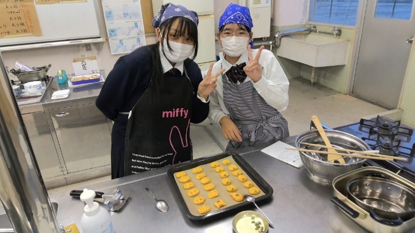 被服製作は個人で作品を製作しています。テディベアやレジンアクセサリー、フェルトマスコットなどおしゃべりもしながら和気あいあいと製作を楽しんでいます。できあがった作品は中学生体験入学や文化祭で展示をして披露しています。調理実習では簡単な洋菓子・和菓子がメインですが、年2回ほど半日授業の日にランチを作って食事をすることもあります。